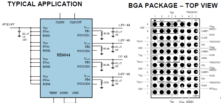 Included in the package are the switching controllers, power FETs, inductors, and all supporting components. Operating from an input voltage range of 4V to 14V, the RE4644 supports an output range of 0.6V to 5.5V, each set by a single external resistor. Its high efficiency design delivers up to 4A continuous current for each output. Only a few input and output capacitors are needed.