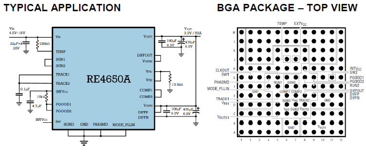 The RE4650A is a dual 25A or single 50A output switching mode step-down DC/DC regulator. Included in the package are the switching controllers, power FETs, inductors, and all supporting components. Operating from an input voltage range of 4.5V to 16V, the RE4650A supports two outputs each with an output voltage range of 0.6V to 5.5V, each set by a single external resistor. Its high efficiency design delivers up to 25A continuous current for each output. Only a few input and output capacitors are needed.