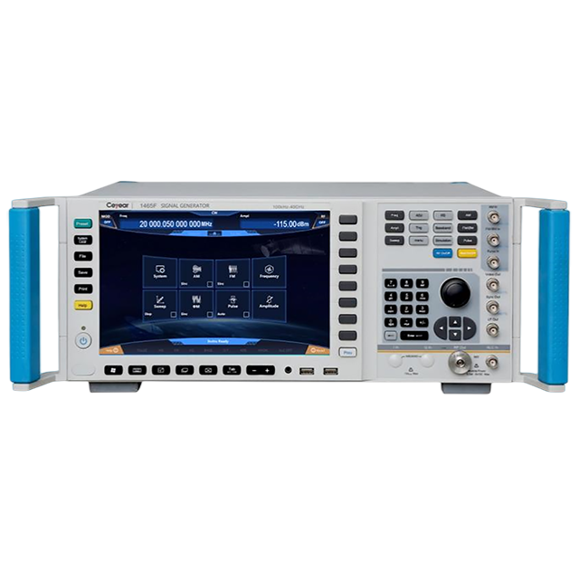 1465 series signal generators, with the frequency range of 100kHz ~ 67GHz, are provided with high purity spectrum and high output power. The single side band phase noise at 10GHz carrier and 10kHz frequency offset is -126dBc/Hz. The maximum output power reaches up to 1W at 20GHz carrier, and the dynamic output power range gets 150dB. All these specifications can meet the high-end requirements of electromagnetic signal tests. In addition, 1465 signal generators own the functions of high-precision analog sweep and high-performance analog and pulse modulation, with maximum bandwidth of internally modulated signal generator up to 10MHz, various signal waveforms, the minimum pulse width of 20ns and flexible pulse trains, which can meet the test requirements of analog and pulse modulations. A 10.1-in. display screen of 1280×800 resolution as well as a number of independent operation styles, such as buttons, mouse and touch screens are equipped so as to improve user experience and test efficiency. 1465 signal generators can generate high-quality continuous-wave or modulated signals, which are not only ideal local oscillation source and clock source, but also high-performance analog simulation signal source. They are mainly used in the radar performance evaluation, high-performance receiver test and components parameter test etc., and applicable to communication and navigation equipment etc.