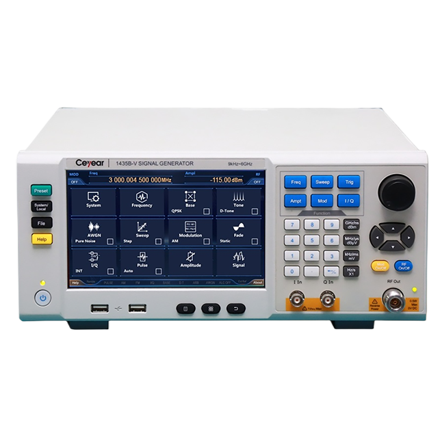 Based on innovative technologies, the 1435 series signal generator achieves balance in terms of performance, economy and volumetric weight. It also has excellent spectral purity, with a single side band (SSB) phase noise of -136dBc/Hz (when the carrier is 1GHz and the frequency offset is 10kHz) or -116dBc/Hz (when the carrier is 10GHz and the frequency offset is 10kHz). It provides a high power output and a large dynamic range, with the maximum output power up to 20dBm@20GHz and an output power dynamic range greater than 150dB. It responds fast and switches to another frequency in only 1ms, which shortens the test time and improves test efficiency, meeting the needs of massive data testing; in addition, it also has excellent analog modulation and pulse modulation functions. By adopting advanced frequency synthesis and RF channel signal processing technologies, it can achieve high performance while reducing the cost. Besides, it is equipped with a 7-inch high-sensitivity LED touch screen, and supports operation by touch screen, panel buttons, rotary knobs, external mouse and keyboard, etc., which fully upgrades the users’ operation experience. It adopts portable 3U chassis structure and is featured by small size and light weight, and thus is easy to carry. The 1435 series signal generator can meet both the test requirements for high performance in the R&D phase and the test requirements for high efficiency in the production phase.